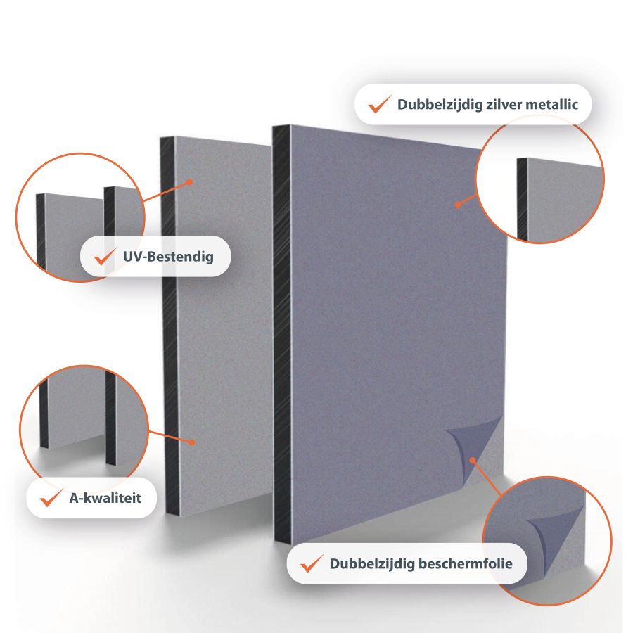 Aluminium composietplaten (ook bekend als Dibond®) combineren een kern van polyethyleen met sterke aluminium toplagen. Licht, stijf en duurzaam, ideaal voor gevelbekleding, bewegwijzering en reclamepanelen.